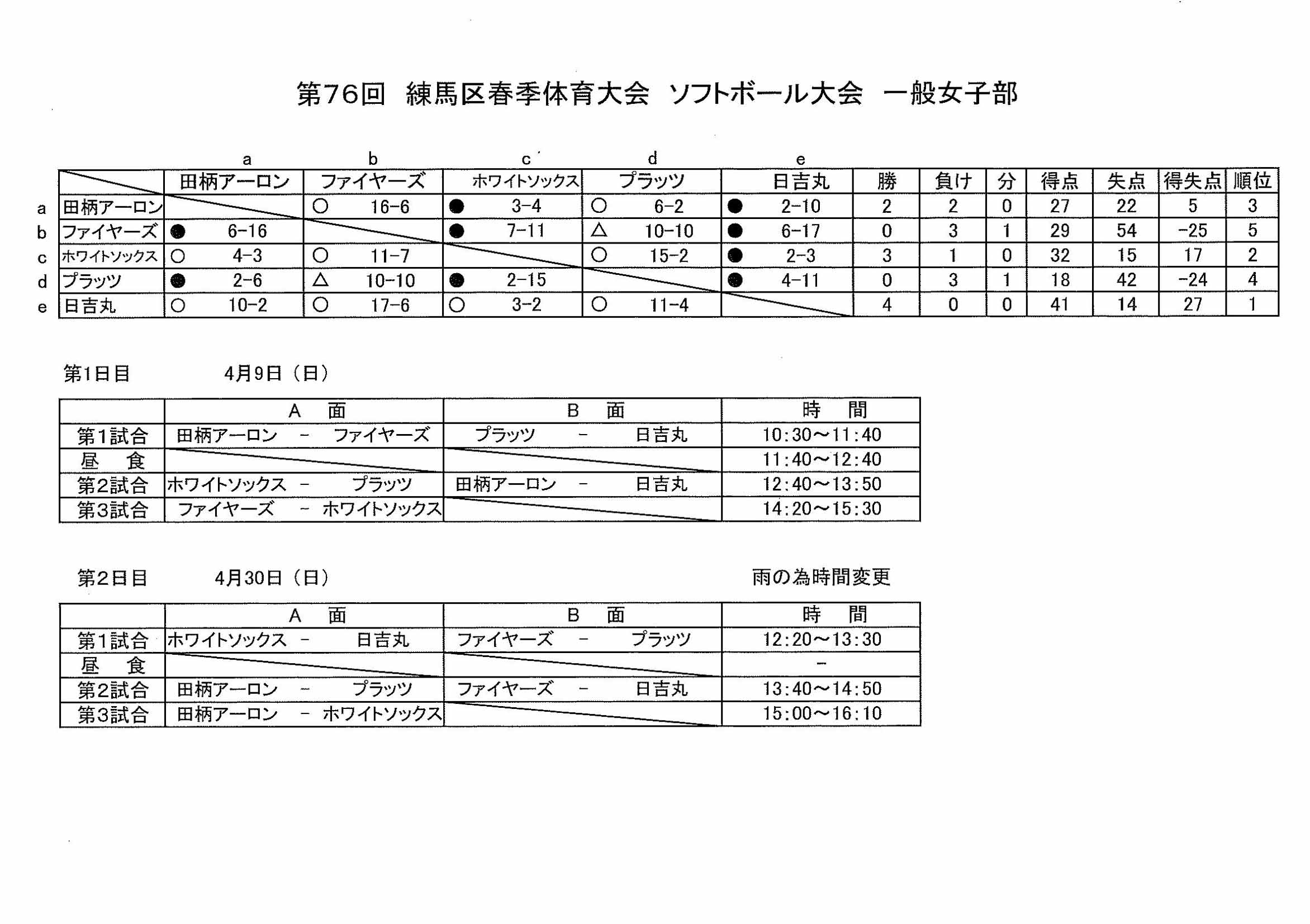 | 2023年 区民体育大会 | 優 勝 石神井スマイル 準優勝 上北小ソフトボール部 第三位 大東チェリーズ 順位表 ▶ | 優 勝 ホワイトソックス 準優勝 田柄アーロン 第三位 練馬ラディッシュ 順位表 ▶ | 優 勝 豊渓ビッグストーンズ ▶ 準優勝 大泉西チェクロス ▶ 第三位 上石神井パイレーツ ▶ 順位表 ▶ | 優 勝 ウイングフット 準優勝 石神井フェニックス 第三位 練馬シニアセブン 順位表 ▶ |